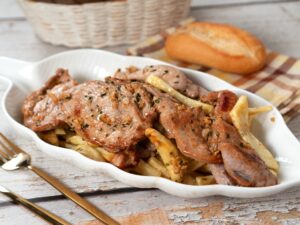 Si hay un plato que nunca falla en la mesa, son unos buenos filetes de ternera preparados con mimo. En esta receta, la carne se cocina en su punto para quedar tierna y jugosa, y se acompaña de una deliciosa salsa de ajo y vino blanco que potencia todo su sabor con ese toque tan casero que tanto gusta. Además, al elaborarse en el mismo aceite, se aprovechan todos los jugos para conseguir un resultado aún más intenso y sabroso. Servidos sobre una base de patatas fritas recién hechas, se convierten en una opción completa, contundente y perfecta para disfrutar en familia con una receta tradicional de las que siempre triunfan.